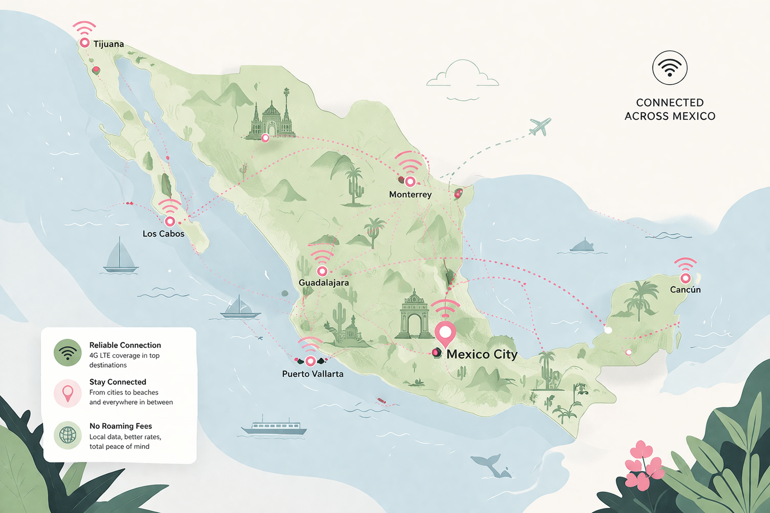 Stay connected in major cities and top destinations including Mexico City, Cancun, and Puerto Vallarta.